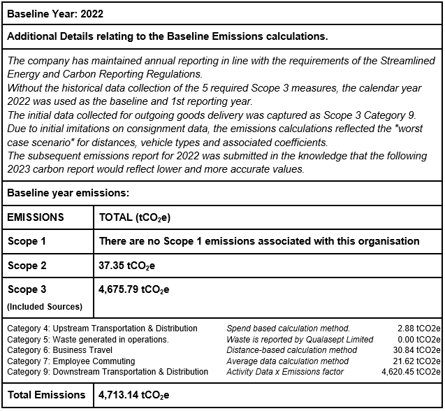 With this more detailed and data driven approach, the overall emission value is more accurate and significantly lower than the baseline and 1st reporting year. The emissions data is now also reported under Scope 3 Category 4 as the activity is completed by a 3rd party logistics provider under contract. As there is no longer any Scope 3 Category 9 activity, reporting will be discontinued for this category.